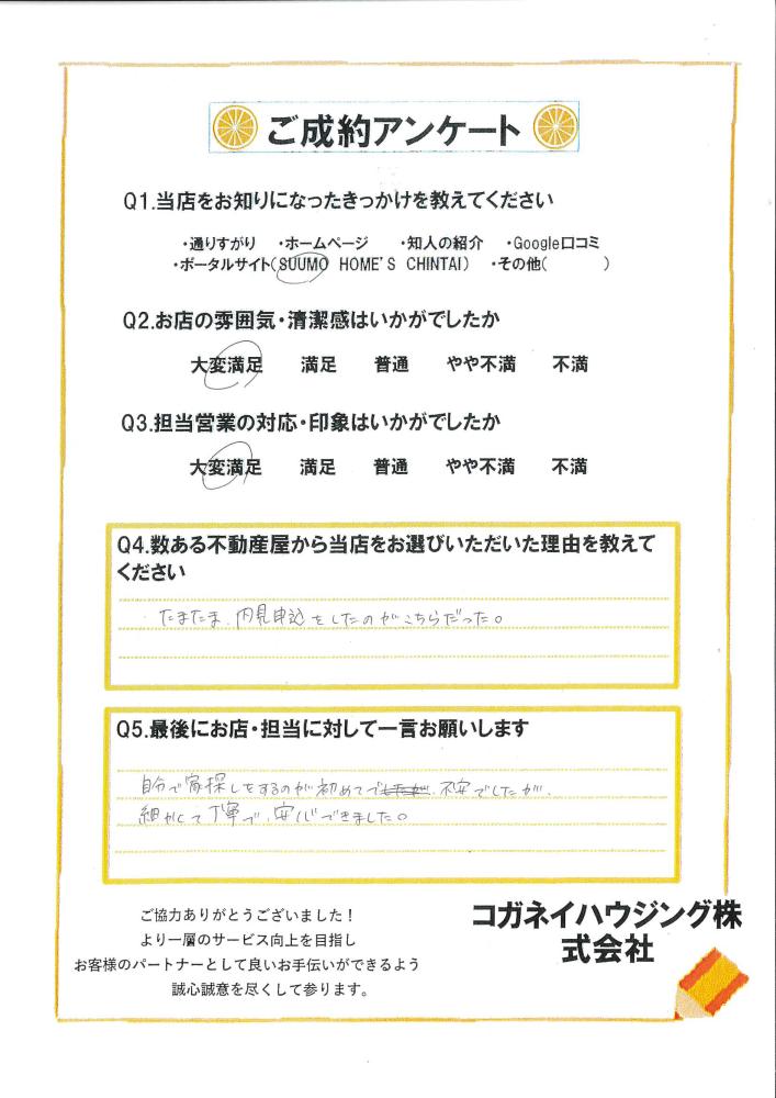 自分で家探しをするのが初めてで不安でしたが、細かくて丁寧で、安心できました。