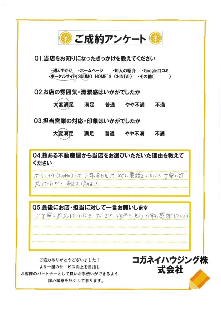 ご丁寧に対応していただき、スムーズに物件も決まり非常に感謝しています。