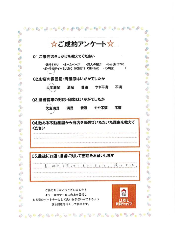 一緒に物件見に行って楽しくお話もできていいお部屋が見つかってよかったです♪